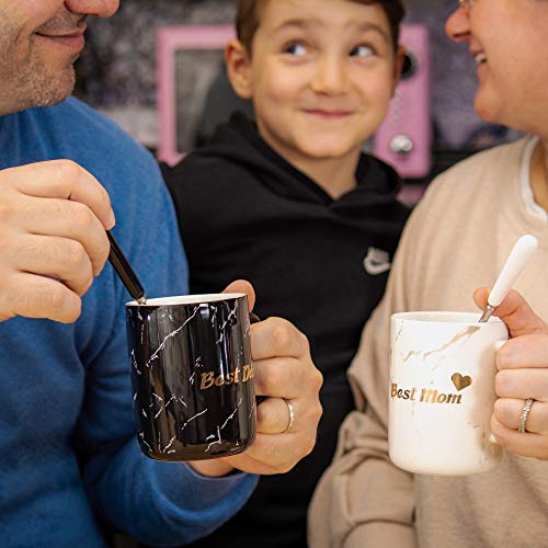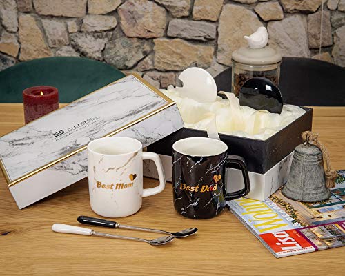 ???? IDEALES GESCHENK: Die wunderschönen Tassen versprühen in jedem Raum und bei jeder Gelegenheit ein positives Lebensgefühl. Sie eignen sich perfekt als wunderbares Geschenk für alle Anlässe wie: Geburtstagsgeschenk, Weihnachten, Ostern, Jubiläum und eine tolle Geschenkidee zum Muttertag oder Vatertag.. ? ANSPRUCHSVOLLES DESIGN: Das wunderschöne Design Marmor Tassen werden nicht nur mit Luxuriös Geschenkverpackung geliefert, sondern auch das Modell begeistert durch eine tolle Farbkombination und kleine Details, die unsere Tassen so besonders machen.. ???? LIFERUMFANG: 1 x Geschenkbox, 1 x 380ml Best Dad Becher, 1 x 380ml Best Mom Becher, 2 x Löffel mit Griff, 2 x Tassendeckel. Die Tassen, Deckel und die Geschenkverpackung sind mit Luftpolsterfolie gesichert.. ? PREMIUM-QUALITÄT: Aus hochwertiger Keramik gefertigt und mit premium goldener Tinte bedruckt. Die glänzende Textur ist von allen Seiten Augenweide. (keine Mikrowille). ???? KUNDENDIENST: Wir überwachen streng die Qualität unserer Produkte. Wenn Sie Fragen haben, können Sie sich gerne an uns wenden. Wir sind immer für Sie da. Sind Sie mit unserem Produkt nicht überzeugt -100% Geld zurück-.