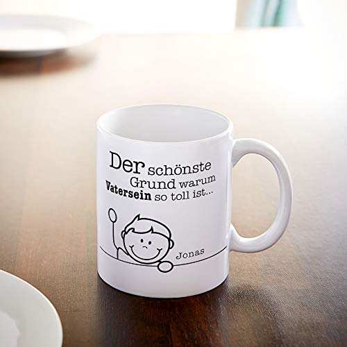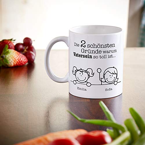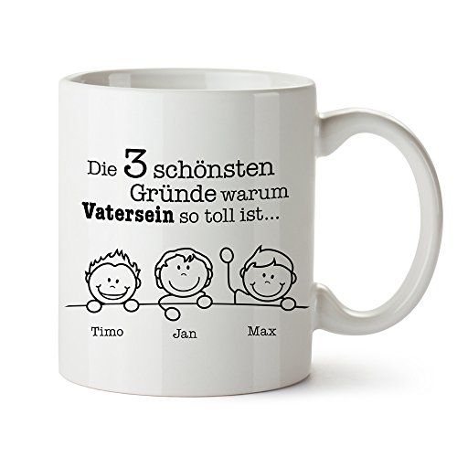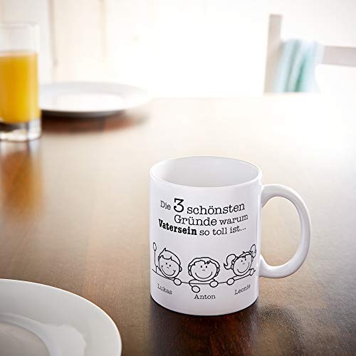 Bedruckter Kaffeebecher: Die weiße Kaffeetasse eignet sich perfekt für den Kaffee am Morgen. Sie wird mit dem Spruch „Die schönsten Gründe warum Vatersein so toll ist…“ und den Namen von bis zu 6 Kindern bedruckt.. Personalisierung: Nutzen Sie bitte die Option "Jetzt anpassen" auf der rechten Seite. Bitte geben Sie zu jedem Namen das Geschlecht an. Beachten Sie, dass die Reihenfolge und Gesichter nicht angepasst werden können.. Geschenkidee für Papas: Dank der liebevollen Gravur der Kinder ist die Kaffeetasse das perfekte Geschenk für Ihren Vater. Ideal als Überraschung zum Geburtstag, zu Weihnachten oder zum Vatertag.. Qualität von Casa Vivente: Jeder Becher wird von unserem geschulten Fachpersonal hergestellt. Wir empfehlen Handwäsche, um den Aufdruck zu schützen.. Maße: Höhe: 8 cm, Durchmesser: 8 cm, Gewicht: ca. 130 g, Fassungsvermögen ca. 300 ml