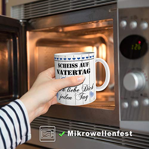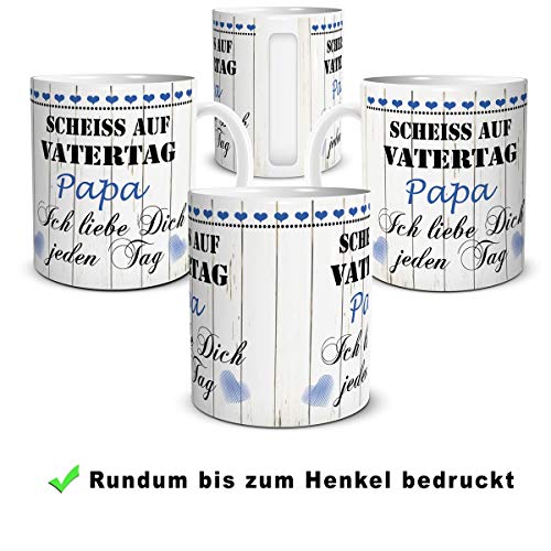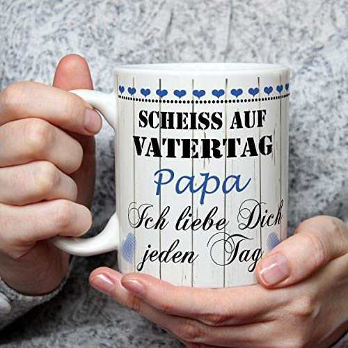 Witzige Geschenkidee - Die lustige Geschenktasse bringt jeden Vater zum Schmunzeln. Damit hast du das Herz von deinem Papa sofort im Sturm erobert. Der beste Liebesbeweis für den liebsten Papi der Welt. Das stilvolle Liebesgeschenk passt sicher nicht nur als Vatertagsgeschenk.. Für alle Papas - Die Tasse mit der Liebesbotschaft ist ein super Geschenk für alle Väter. Du kannst sie deinem Lieblingspapa auch zum Geburtstag schenken. Mit dem Liebesspruch "Scheiß auf Vatertag" erinnert sie deinen Vater - bei der Arbeit im Büro oder zu Hause - jeden Tag an deine Liebe.. Fröhlicher Genuss - Die dickwandige Kaffeetasse hält den Kaffee oder Tee länger warm. Ihr großes Fassungsvermögen sorgt für längeren Kaffeegenuss und dank dem stabilen großen Henkel lässt sie sich gut in der Hand halten. Jede Tasse wird schnell und sicher verpackt geliefert.. Hohe Qualität - Der hochwertige Kaffeebecher ist in Deutschland von Hand bedruckt und spülmaschinengeeignet. Das farbenfrohe Motiv auf dem Becher ist rundum bis zum Henkel gedruckt, so dass er auch für Linkshänder geeignet ist.. Gute Laune im Alltag - Ganz getreu dem Spruch "Kaffee am Morgen vertreibt Kummer Sorgen". Gerne setzen wir Ihren Namen und Design Wünsche um. Schreiben Sie uns einfach. Aus einer personalisierten Café-Tasse schmeckt es doppelt gut.