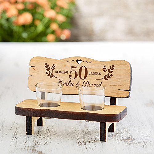 BANK MIT SCHNAPSGLÄSERN: Auf die Liebe! Die Miniatur-Gartenbank aus Erlenholz wird mit romantischen Schnitzereien verziert. Auf das Holzbänkchen werden zwei Wunschnamen und ein Datum graviert.. INDIVIDUELLE GRAVUR: Um uns Ihre Personalisierungsangaben mitzuteilen, nutzen Sie bitte die Option " Jetzt anpassen" auf der rechten Seite. Bitte achten Sie auf die korrekte Rechtschreibung.. GESCHENKIDEE ZUM 50. HOCHZEITSTAG: Mit den beiden Schnaps-Gläsern können die Beschenkten auf ihre langjährige Ehe anstoßen. Ein schönes Präsent zur Gold-Hochzeit für die Eltern, Oma und Opa sowie Freunde und Bekannte.. QUALITÄT VON CASA VIVENTE: Die Mini-Holzbank aus geöltem Erlenholz wird sorgfältig für Sie graviert. Die kleinen Shotgläser werden aus Echtglas gefertigt.. MAßE: Schnaps-Bank 16,5 x 8 x 8 cm, Gewicht: ca. 330 g