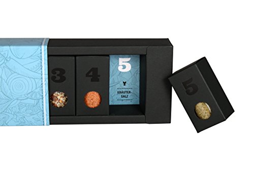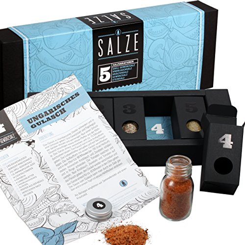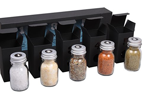 Das 5er-Gewürzset „Salze“ enthält 5 unterschiedliche Salzvariationen, mit denen sich jedes Gericht einzigartig verfeinern lässt. Jeder erlesenen Salzkomposition ist außerdem ein Rezeptvorschlag für ein raffiniertes Gericht beigelegt - ein ideales und immer willkommenes Geschenk!. Format: 260 x 95 x 40mm; Gesamtabfüllgewicht: 160 g - Bitte beachten Sie, dass Füllhöhen in den Gläsern technisch bedingt variieren können. Materialien: hochwertiger schwarzer Karton aus italienischem Feinstpapier, Glas mit Metallverschluss zum Wiederbefüllen, Rezept-Papier, bedruckte Kartonbanderole. Salze: Steinsalz, Gewürzsalz, Grill-Gewürzsalz, Kräutersalz, Knoblauchsalz