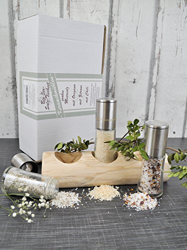 direct&friendly 3er Bio Tischset und Salz Geschenkset Mühlen mit Salz mit Chili,Oregano, Zitrone und Holzboard aus regionalem Holz aus Württemberg
