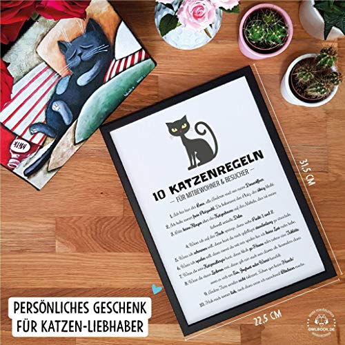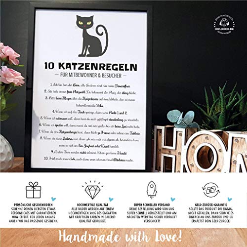 <b>MIT VIEL LIEBE HERGESTELLT:</b> Unsere Produkte werden mit viel Liebe zum Detail gestaltet und per Hand in unserer Manufaktur in Strausberg hergestellt. Du erhältst somit immer ein echtes Handmade Produkt in Top Qualität.. <b>EIN EDLER RAHMEN RUNDET DAS BILD AB:</b> Das liebevoll gestaltete Bild in DIN A4 wird in einem edlen schwarzen Rahmen aus Pinienholz mit den Maßen 23,5 x 32,5 cm geliefert, der sowohl zum Hinstellen als auch zum Anhängen geeignet ist.. <b>EINE LEBENSLANGE FREUDE:</b> Das Motiv wird in Galeriequalität mit kräftigen Farben auf weißem stabilen Fotokarton gedruckt und wird durch das bruchsichere und lichtundurchlässige Kunstglas vom Bilderrahmen optimal geschützt. Das Bild ist somit licht- und alterungsbeständig - so bleibt die Freude am Bild ein Leben lang erhalten.. <b>SCHÖNE GESCHENKIDEE:</b> Das liebevoll gestaltete Produkt ist eine schöne Geschenkidee zu Weihnachten, zum Geburtstag oder für Zwischendurch für alle Katzenliebhaber. Überrasche einen lieben Menschen mit einem persönlichen Geschenk, das von Herzen kommt.. <b>100% ZUFRIEDENHEIT:</b> Das Produkt wird mit viel Liebe in unserer Manufaktur in Deutschland in Handarbeit hergestellt. Die Qualität unserer Produkte liegt uns dabei sehr am Herzen. Solltest Du dennoch unzufrieden sein, erhältst Du Dein Geld zurück!