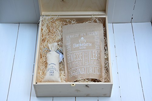 Inhalt der BROTundSALZbox: 1x Backmischung, 1x 300g Luisenhaller Tiefensalz fein im Leinensäckchen, 1 Päckchen Fontaine Trockenhefe 10 Gramm, 1 Holzbox ... [mehr]