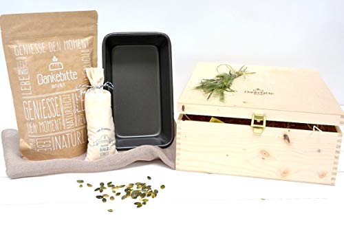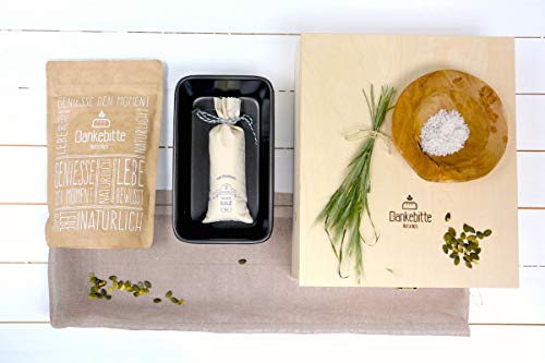 Inhalt der BROTundSALZbox: 1x Backmischung, 1x 300g Luisenhaller Tiefensalz fein im Leinensäckchen, 1 Päckchen Fontaine Trockenhefe 10 Gramm, 1 Holzbox, 1 Brotbackform ... [mehr]