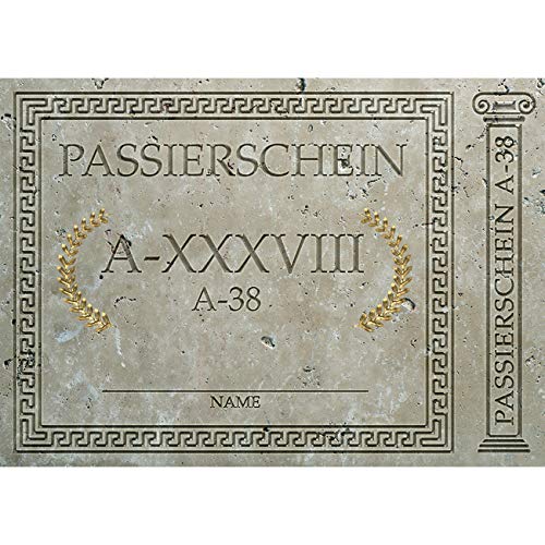 PASSIERSCHEIN A38 - Schon vor 2000 Jahren haben Behördengänge dafür gesorgt, dass unbescholtene Bürger verrückt wurden. Mit dem Passierschein A38 kannst Du diesem Schicksal aber nun aus dem Weg gehen!. SET MIT 10 SCHEINEN - Das Set enthält zehn Exemplare des legendären Passierscheins A38, wie er aus dem Zeichentrick-Film über unbeugsame Gallier in der Hauptstadt des Römischen Reichs bekannt ist.. AKTUALISIERTE VERSION - Natürlich handelt es sich um die aktualisierte Fassung nach Rundschreiben B65. Damit solltest Du selbst im "Haus, das Verrückte macht" unbeanstandet passieren dürfen.. GOLDENE APPLIKATIONEN - Der goldene Lorbeerkranz lässt direkt erahnen, dass Du ein wahrlich wichtiges Stück Geschichte in Händen hältst und verleiht dem Passierschein außerdem die nötige Gravitas.. PERFEKTE GESCHENKIDEE - Die Passierscheine verhindern, dass man bei Behördengängen den Verstand verliert und sind damit ein ideales Geschenk für alle, die unter Behörden und Beamten leiden müssen.