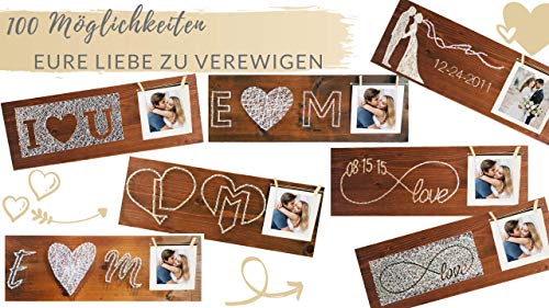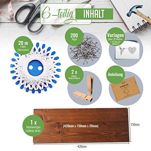 ? UNSER BESTSELLER besteht aus: ? 1 Echtholz-Brett aus hochwertigem Fichtenholz (glatt geschliffen, Maße: 420 x 150 x 20 mm) ? 200 Nägeln verzinkt ? 1 x 20 Meter Baumwoll-Faden ? 2 Holz-Klammern ? Papier-Vorlagen ermöglichen über 30 unterschiedliche Wort- und Bildmotive ? 1 Step-by-Step Anleitung für ein einfaches basteln. ???? GRENZENLOSE KREATIVITÄT - Wer es liebt zu basteln, wird an diesem Set seine volle Begeisterung finden. Es enthält alles, was man für die Umsetzung künstlerischer Gedanken. ???? AUSGEFALLENE DEKO: Das DIY String Art Set ermöglicht Buchstaben, Motive und Zeichen personalisierbar zu gestalten und garantiert so einen besonderen Blickfang in jeder Einrichtung. Zudem eignet es sich für verschiedenste Arten von kreativer FADENKUNST: Ob als außergewöhnliches Geschenk zur Einweihung, zum Geburtstag, als Liebesgeschenk für den Partner, zur Geburt, zum Muttertag und Vatertag oder als Do It Yourself Bastel-Idee für Ihr Zuhause - GRENZENLOSE KREATIVITÄT ist geboten.. ???? EINFACHHEIT: In nur wenigen Schritten zum eigenen HANDMADE Kunstwerk. Durch eine ausführliche Step-by-Step Anleitung ist die Fadenkunst FÜR JEDEN umsetzbar und bedarf keinerlei Vorkenntnisse - Die perfekte GESCHENKIDEE aber auch für die eigene Bastel-KUNST hervorragend geeignet.. ???? EXZELLENTES DESIGN - die Verpackung aus formfestem Karton liefert nicht nur eine sehr stabile und praktische Aufbewahrung, sondern sieht zudem noch äußerst edel aus. Somit eine rundum hochwertige Geschenkverpackung für den künstlerischen, kreativen Einsatz.. ???? 100% ZUFRIEDEN: Ihr Wohlbefinden hat für uns höchste Priorität, bei jeglichen Problemen garantieren wir Ihnen eine zufriedenstellende Lösung. Kontaktieren Sie dafür einfach unseren Rund-um-die-Uhr Kundenservice!