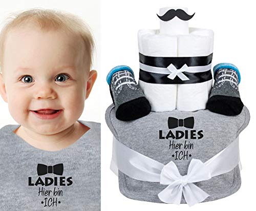 INHALT WINDELTORTE „ Junge“ mit coolem Spruch „Ladies hier bin ich“ 1x Babylätzchen mit Druck, 1x Babysocken Größe 0-12 Monate, 21 Marken Windeln -Standard Windelgröße ist Größe 2 (4-8kg) Premium Protection. In unserer Produktion in Thaleischweiler-Fröschen wird mit sehr viel Liebe zum Detail die Windeltorten in Handarbeit hergestellt. Wir verwenden nur MARKEN WINDELN für unsere Diaper Cakes.. UNSERE BABYMODE wird in Deutschland in unserer Produktion im Transferverfahren HANDMADE bedruckt. Dieser Druck bietet eine tolle Leuchtkraft und eine klasse Haltbarkeit, auch nach vielen Wäschen. WINDELTORTEN das besondere Babygeschenk. In liebevoller HANDARBEIT werden unsere Torten aus Windeln in Deutschland fair hergestellt. Das ideale Geschenk zur Geburt oder Babyparty. Unsere Windeltorten werden hochwertig mit cooler Baby Mode bestückt ein sinnvolles und nützliches Geschenk fürs Baby und die frischgebackenen Eltern. Die Windeltorten werden nach der Herstelllung in einem trendigen Geschenkkarton mit Sichtfenster verpackt,so kannst du dir sicher sein dass deine Windeltorte sicher bei dir ankommt.