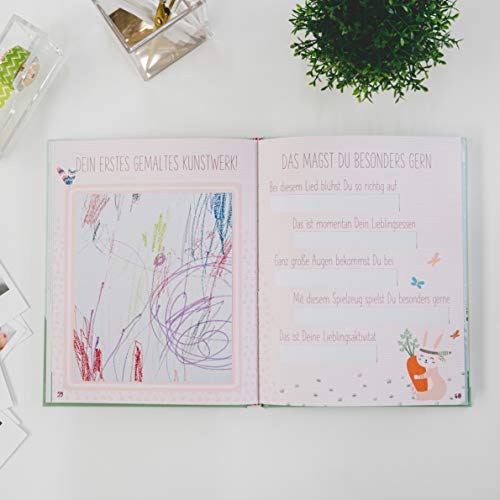 ???? 78 Seiten Inhalt: Angefangen beim Einkleben von Fotos, über das Dokumentieren von Meilensteinen bis hin zum Festhalten der Entwicklung Deines Kindes! Das Album bietet Dir ausreichend Platz!. ???? Liebevoll gestaltetes Design: Die kleine Waldtierfamilie im Indianer-Look lässt Kinderaugen strahlen. Jede Seite ist individuell gestaltet und thematisch passend an die Kapitel angelehnt.. ???? Perfektes Geschenk: Ob zur Schwangerschaft, Geburt oder Taufe - dieses Erinnerungsalbum ist das ideale Geschenk. Nichts ist schöner als die ersten Erinnerungen des eigenen Kindes festzuhalten.. ????? Einzigartige Inhalte & Vorlagen: Das Buch beinhaltet Kapitel wie Hand-und Fußabdrücke, Persönlichkeit des Kindes, Stammbaum, Blick in die Zukunft, Entwicklung, Familie und vieles mehr!. ???? Unisex: Dieses Fotoalbum ist durch die neutralen Farben sowohl für Mädchen als auch für Jungen geeignet. Ebenso die Waldtiere sind unisex designed (Fuchs, Hase, Eule, Eichhörnchen und Vogel)
