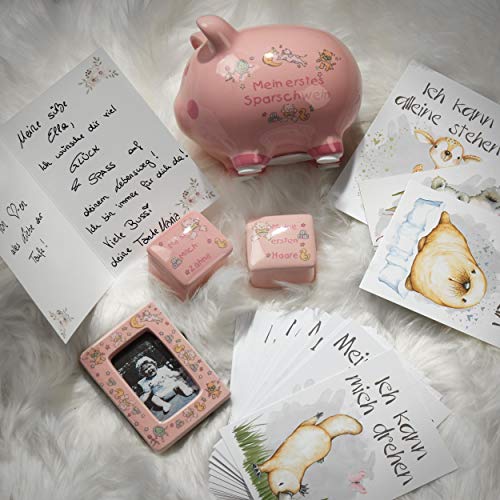 ???? Baby Geschenk zur Taufe Mädchen, niedliches Taufgeschenk für Mädchen, Spardose Taufe, Mein erstes Sparschwein, Meine ersten Haare, Meine Milchzähne, Bilderrahmen Baby. ???? Inhalt: 1 Sparschwein, 2 Döschen, 1 Bilderrahmen zum Aufstellen (Foto max. 7,5x5cm), Meilensteinkarten-Set 40 verschiedenen Motive; rosa Geschenkkarton (27x18x13,5cm), weißes Geschenkband aus Satin, süße Baby Geschenkkarte. ???? Spardose Baby mit wiederverschließbarer Öffnung, Döschen mit Deckel und Bilderrahmen aus Keramik in rosa mit niedlichen Motiven für Babys, Geschenkidee Geburt, Geschenkset Baby. ???? Meilensteinkarten neutral mit süßen Tierchen, 40 wichtigste Meilensteine im ersten Lebensjahr auf hochwertigem A6 Karton (400g/m²), Meilensteinkarten Junge und Mädchen, Geburt bis erster Geburtstag. ???? Süße Geschenkkarte macht das Geschenkset komplett als Geschenke zur Taufe, Geschenke Geburt, Geschenk Schwangerschaft oder Geschenk Babyparty, Babygeschenke, Taufgeschenke Mädchen