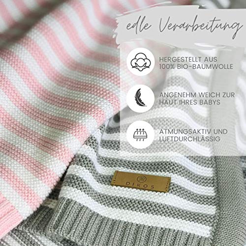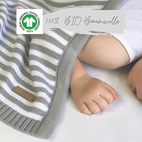 ??HOCHWERTIGE BIO QUALITÄT & OPTIMALE GRÖßE: Die GOTS zertifizierte BIO-Baumwoll Babydecke ist 75x100 cm groß. Sie besteht aus zwei schönen Farben und ist durch das natürliche Material und den lockeren Strick sehr atmungsaktiv. Die schlichten Streifen lassen die Decke in jedem Kinderwagen stylisch aussehen. Sie ist zweiseitig nutzbar und bei 30 Grad leicht waschbar. Die Babydecke ist in einer nachhaltigen Box mit einer Baumwollschleife verpackt und lässt sich damit auch bestens verschenken.. ??TRENDIGES und ZEITLOSES DESIGN: Die Baby Strickdecke besteht aus einem schlichten Strickmuster und einem zarten Streifendesign. Die Mischung aus dem edlen Strick und der feinen BIO-Baumwolle lässt sofort erkennen, dass sie hochwertig ist. Diese kuschlige Neugeborenendecke ist ein wahrer Design Hingucker für eine hochwertige Babyausstattung.. ??VIELE EINSATZMÖGLICHKEITEN: Eine gute Baby-Decke wird im Laufe des Baby- und Kleinkindalters sehr häufig gebraucht. Die Babydecke kommt sehr häufig zu Hause zum Einsatz. Ob zum Spielen, Zudecken beim Schlafen, Krabbeln oder im Laufstall, sie wird häufig im Alltag verwendet. Aber auch im Outdoor Bereich zum Mitnehmen für Draußen darf sie nie fehlen. Hier wird sie häufig für den Kindersitz, Kinderwagen oder Buggy, Autoschale oder als Wickel-Unterlage für unterwegs verwendet.. ??PERFEKTES GESCHENK in EDLER VERPACKUNG: Sie möchten etwas für die Grund-Ausstattung eines Neugeborenen schenken, das unabhängig von seiner Größe ist und sehr häufig genutzt wird. Dann haben Sie Ihr Geschenk gefunden – das flauschige Babydecke-Set! Ob Sie als Tante, Patentante oder Großeltern ein Erstlings-Set / Starterset suchen, diese Geschenk-Idee wird Mama und Papa lange in Erinnerung bleiben. Die edle hochwertige Box mit Schleife macht das Gastgeschenk zu einem echten Hingucker.. ??NATÜRLICHE FARBEN: Aufgrund ihrer zarten Streifen lässt sich diese Decke zur feierlichen Taufe oder einem Baby-Fotoshooting als eins der Requisiten einsetzten. Die Babybaumwolldeckel lässt sich sowohl für Jungen als auch für Mädchen nutzen. Sie ist in den Farben grau und rosa verfügbar. Aufgrund ihres dezenten Designs schmückt sie jedes Baby-Zimmer und darf bei keiner Baby Erstausstattung fehlen.