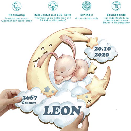 PERSÖNLICHES GESCHENK: Als individuelle Wandlampe aus Holz, ist es die ideale Geschenkidee für deine(n) Liebste(n) - persönlich und von Herzen. Für kleine Häschen sowie junge Eltern. SCHNELLE LIEFERUNG: Trotz individueller Fertigung ist es unser Ziel binnen 2 Tagen dein persönliches Holzbild zu versenden, damit es auch zum Kindergeburtstag, Einschulung, Weihnachten oder Ostern ankommt. SCHÖNE DEKORATION: Keine Massenware! Wir fertigen all unsere Produkte mit viel Hingabe in unserer Manufaktur in Hamburg. Dein Einzelstück im Häschen-Look wird persönlich für dich gefertigt und ist der Hingucker im Kinderzimmer. BELEUCHTUNG & STYLE: Unsere Wandlampe ist nachhaltig mit einer LED Lichterkette versehen (AA-Akkus (Batterien)). Als Designs verfügbar: Im DIY-Holz-Look oder in brillianter Farbe sowie 2 Größen erhältlich. NACHHALTIGKEIT: Ist für uns keine Floskel! Natürliche und regenerative Materialen sind für uns Vorraussetzung. Dazu pflanzen wir mit unserem Partner: Eden für jede Bestellung einen Baum in Madagaskar!