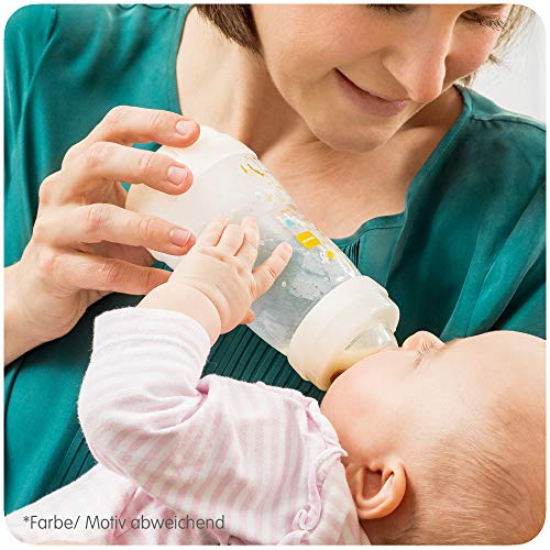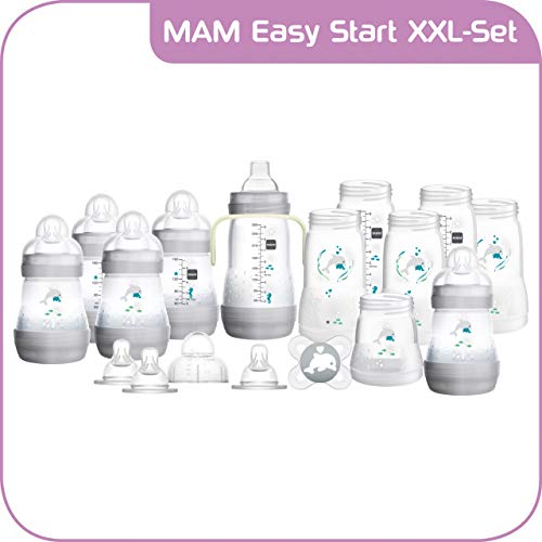 Praktisches Set – Das MAM Flaschen Set ist die ideale Baby-Erstausstattung. Die Flaschenkörper lassen sich kombinieren und wachsen so mit dem Baby mit. Optimal ausgestattet – Das Baby Flaschen Set besteht aus 6 Baby Trinkflaschen (160 ml), 6 Flaschenkörpern (260 ml), weiteren Saugern, einem Trinkschnabel, Griff und Schnuller. Anti-Colic – Die Babyflasche besitzt ein Bodenventil, das Koliken vorbeugt. Stillfreundlich – Der Skin Soft Sauger sorgt für ein vertrautes Gefühl – wie beim Stillen an Mamas Brust. Lieferumfang und Details – MAM Easy Start Anti-Colic Set XXL, 6x Baby Trinkflasche (160 ml), 6x Flaschenkörper (260 ml), 6x Sauger Größe 1, 2x Sauger Größe 2, 1x Trinkschnabel, 1x Griff, 1x MAM Start Schnuller, ab Geburt, grau, Artikelnr. 72172420