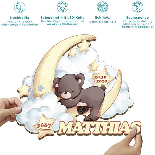 PERSÖNLICHES GESCHENK: Als individuelle Wandlampe aus Holz, ist es die ideale Geschenkidee für deine(n) Liebste(n) - persönlich und von Herzen. Für kleine Bäreninnen & Bären sowie junge Eltern. SCHNELLE LIEFERUNG: Trotz individueller Fertigung ist es unser Ziel binnen 2 Tagen dein persönliches Holzbild zu versenden, damit es auch zum Kindergeburtstag, Einschulung, Weihnachten oder Ostern ankommt. SCHÖNE DEKORATION: Keine Massenware! Wir fertigen all unsere Produkte mit viel Hingabe in unserer Manufaktur in Hamburg. Dein Einzelstück im Bärchen-Look wird persönlich für dich gefertigt und ist der Hingucker im Kinderzimmer. BELEUCHTUNG & STYLE: Unsere Wandlampe ist nachhaltig mit einer LED Lichterkette versehen (AA-Akkus (Batterien)). Als Designs verfügbar: Im DIY-Holz-Look oder in brillianter Farbe sowie 2 Größen erhältlich. NACHHALTIGKEIT: Ist für uns keine Floskel! Natürliche und regenerative Materialen sind für uns Vorraussetzung. Dazu pflanzen wir mit unserem Partner: Eden für jede Bestellung einen Baum in Madagaskar!