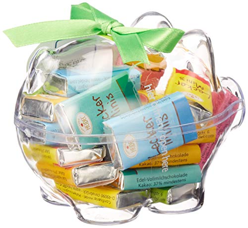 kleines niedliches Plasikschweinchen. gefüllt mit leckeren 3g Edelvollmilchtäfelchen. der süße Glücksbote. ganz viel Glück im kleinen Schweinchen. Als Spardose verwendbar