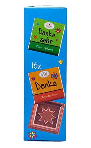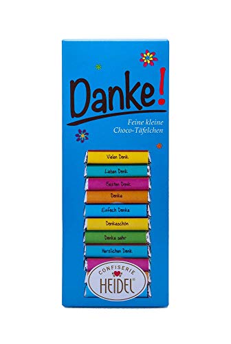 Heidel Danke ist ein liebevolles Präsent.. Aus feiner Edel-Vollmilchschokolade.. Die kleinen Täfelchen zergehen auf der Zunge.. Auf der Umverpackung und den Täfelchen sind verschiedene Dankessprüche aufgedruckt.. In Stilvoller Box.