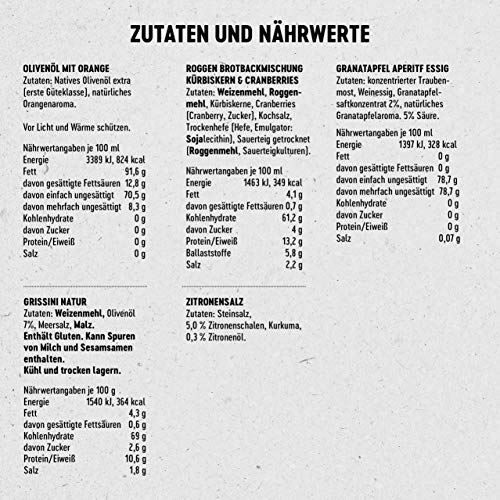 DANKE SAGEN - Möchten Sie Ihren Liebsten einfach mal wieder Danke sagen? Dann haben Sie mit diesem Geschenkset die perfekte Möglichkeit dazu. Ob für Eltern, Freunde, Oma und Opa oder Partner und Partnerin. ***Aufgrund von Lieferschwierigkeiten in der aktuellen Situation mussten wir den Inhalt der Box verändern. Leider hatten wir die Banderolen für die Box schon gedruckt, auf deren Rückseite wir noch von Pasta und Pastasauce in der Box sprechen.***. DAS ERWARTET FEINSCHMECKER – Gefüllt mit einer Auswahl an besten Spezialitäten, macht dieser Präsentkorb Genießer glücklich: Zitronensalz, mit Zitronenöl verfeinert, italienisches Olivenöl mit Orangenaroma, unser fruchtiger Granatapfel Essig, knussprige Grissini aus dem Piemont und dazu eine herzhafte Brotbackmischung mit Kürbiskernen und Cranberries.. FREI VON KÜNSTLICHEN ZUSÄTZEN - Unsere Produkte werden nach eigener Rezep-tur mit befreundeten Manufakturen hergestellt und unterliegen dabei immer Roja Gepp‘s Reinheitsgebot: frei von künstlichen Zusatzstoffen, Geschmacksverstärkern oder künstli-chen Aromen entstehen dabei Spezialitäten, die nicht nur Feinschmecker begeistern.. GEPP’S QUALITÄT - Die Box ist eine Zusammenstellung feinster Zutaten nach den hauseigenen Rezepturen des Familienunternehmens Gepp’s. Verschenken Sie besondere Geschmackserlebnis-se und begeistern Sie Ihre Liebsten oder Freunde und Bekannte.. UNSERE BESTSELLER - Unser Sortiment bietet viele weitere tolle Geschenkideen. Ob unsere Grillmeister Box für Männer, das Verwöhnpaket für Frauen oder unser Klassiker, die Bella Italia Box. Lassen Sie sich inspirieren!