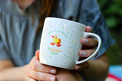 Jeden Tag ein kleines QuEntchen Glück – Das ist das Motto dieser Tasse. Nach einer Vorlage von Klaus Puth.. Der wunderschöne Becher aus Porzellan im Entchen Design ist der Hingucker auf jedem Tisch.. Ob für Kaffee, Tee oder Kaltgetränke, im Büro oder zuhause – die Tasse mit der Ente ist überall dabei. Maße: 9 cm x 8, 7 cm x 12, 8 cm.. Die liebevoll gestaltete Tasse hat außen und innen einen Motivdruck und ist spülmaschinengeeignet.. In der passenden Verpackung eignet sich die Kaffeetasse als Geschenk zum Geburtstag, zur Hochzeit oder zu jedem Anlass zu dem man Glück wünschen möchte. Maße der Verpackung 9, 5 cm x 10, 5 cm x 11 cm