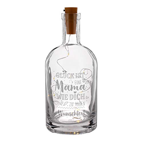 Geschenk zum Muttertag - Mit der Gravur des Spruchs "Glück ist eine Mama wie dich zu haben" auf der Flasche in Kombination mit dem Flaschenlicht bekommen Sie ein dekoratives Muttertagsgeschenk mit Kompliment für die Mama.. Persönliche Gravur - Damit das Geschenk für die Mama auch was Persönliches von Ihnen enthält, gravieren wir Ihren Wunschtext unter den Spruch. Dafür stehen Ihnen 20 Zeichen zur Verfügung. Bitte sehen Sie von Herzchen und Emoticons ab.. Kreative Geschenkidee - Die gravierte Flasche kann natürlich auch als Glasflasche benutzt werden. Doch das mitgelieferte Flaschenlicht macht das Geschenkset zu einem besonders dekorativen Präsent. Die kleinen LED Lichter sehen einfach wunderschön aus.. Dekoidee - Sie können die Flasche auch im Inneren mit Dekoelementen oder Fotos bestücken. Die Lichterkette (inkl. Batterie) wird dies schön zum Erleuchten bringen.. Einfach Freude schenken - Geben Sie Ihre persönliche Widmung unter "Jetzt anpassen" ein und in wenigen Tagen ist das Muttertagsgeschenk bei Ihnen. Es wird Ihrer Mama ganz sicher sehr gefallen.