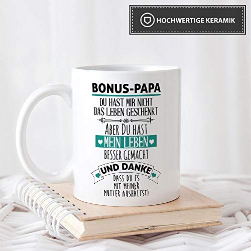 Liebevoll gestaltete Motiv-Tasse für den liebsten Stiefpapa mit schönem Danke Spruch zum Geburtstag oder als kleine Aufmerksamkeit zwischendurch. Bedruckter Kaffeebecher aus hochwertiger Keramik mit schönem Spruch für alle Bonus Papas - einfach die beste Geschenkidee. Spülmaschinenfest (für mehr als 1000 Spülungen) und mikrowellengeeignet - Höhe: 9,5 cm - Ø 8 cm - Gewicht: 350g - Füllmenge 300ml. Durch den Druck links und rechts vom Henkel ist diese Tasse besonders für Links- und Rechtshänder geeignet. Hochwertiger Qualitätsdruck - Made in Germany - seit über 20 Jahren ihr Spezialist für bedruckte Trinkgefäße - viele weitere witzige Motiv-Tassen finden Sie bei uns im Amazon Shop