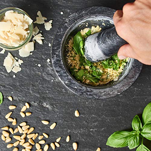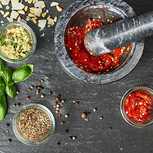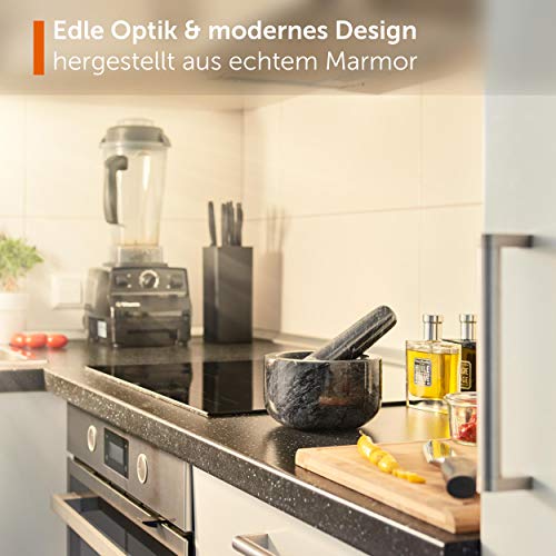 REINES NATURPRODUKT - Mörser und Stößel werden aus hochwertigem Marmor gefertigt. Im Gegensatz zu anderen Materialien wie Holz oder Metall verfälscht Marmor nicht den Geschmack des gemahlenen Inhalts.. INKL. ANTIRUTSCH-PAD - Dank des enthaltenen Antirutsch-Pads steht der Mörser vollkommen stabil und rutschfest beim Mahlen. Zudem wird deine Arbeitsfläche ideal geschützt und bleibt verschont vor Kratzern!. LEICHTE ANWENDUNG - Aufgrund der speziell angerauten Fläche an der Innenseite des Mörsers und dem Ende des Stößels zerkleinern Sie frische Kräuter, Gewürze, Nüsse und vieles mehr im Handumdrehen!. EINZIGARTIGES DESIGN - Jedes madeco Mörser-Set ist dank der natürlichen Marmorierung ein Unikat. Das formschöne Design ist ein dekorativer Blickfang für Ihre Küche und durch die polierte Oberfläche edler als Granit.. PERFEKT ABGESTIMMT - Mörser und Schlegel wurden perfekt aufeinander abgestimmt, um Ihnen das beste Mahlergebnis zu garantieren. Die Mörserschale hat mit 400 ml Füllvolumen die optimale Größe und liegt gut in der Hand.