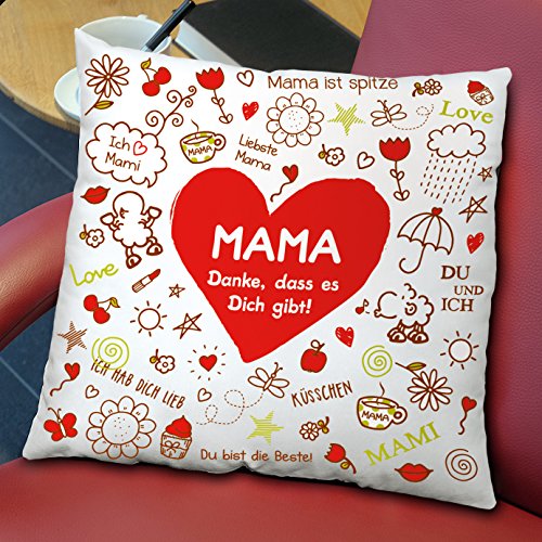 Schönes Baumwoll-Kissen im aktuellen sheepworld Trend-Design, zum Dekorieren und Kombinieren. Zier-Kissen mit Spruch, Maße: 40 cm x 40 cm, Obermaterial: 100% Baumwolle, Füllung: 100% Polyester. Besonders pflegeleicht und praktisch, da waschbar bei 40 Grad. Motiv-Druck mit liebevoller Botschaft „Mama – Danke, dass es Dich gibt!“, im Doodle-Look beidseitig bedruckt. Ein wunderbares Geschenk zum Muttertag, zum Valentinstag, zu Weihnachten, zum Geburtstag oder zu einem der unzähligen weiteren Anlässe, zu denen man seiner Mama eine besondere Freude machen möchte