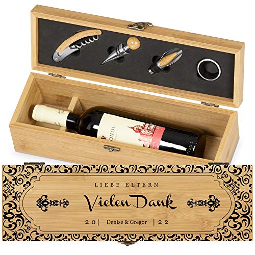 ???? STILVOLLES GESCHENKSET: die dekorative, rustikale Weinflaschen-Geschenkbox mit Platz für eine Flasche in gängiger Größe mit 0,7 L Fassungsvermögen mit personalisiertem Aufdruck und dem schönen Öffnungs- und Schließmechanismus. Die Weinkiste beinhaltet 4 teiliges Edelstahl Zubehörset (1x Kellnermesser, 1x Flaschenverschluss, 1x Weinausgießer mit Verschluss, 1x Flaschenkragen) und wird aus Bambus gefertigt. Sie ist ein rustikales Highlight und eine umweltfreundliche Alternative zur Plastiktüte!. ???? GESCHENKIDEE FÜR PAARE: das Weinset ist eine großartige Geschenkidee vor allem für das Brautpaar, aber auch für die Eltern, Großeltern, Brautpaar, Liebespaar oder Ehepaar - einfach für die echten Weingenießer! Die personalisierbare, rustikale Weinkiste eignet sich ideal vor allem als Geschenk z.B. zur Hochzeit, aber auch zum 25., 30., 40., 50. Hochzeitstag, Valentinstag, oder zu Weihnachten. Die Muster wurden extra für Paare kreiert. Sie ist ein echter Hingucker!. ???? PERSONALISIERTER AUFDRUCK: um der Weinbox einen individuellen Charakter zu verleihen, können Sie diese mit Ihrem Wunschtext bedrucken lassen. Für Ihren Individualisierungswunsch nutzen Sie bitte die Option „Jetzt anpassen” auf der rechten Seite. Lassen Sie sich von passenden Widmungen, Glückwünschen oder Sprüchen inspirieren, die in unserem Angebot zu Ihrer Verfügung stehen.. ???? SCHLICHTES DESIGN: Die Weinbox überzeugt mit schlichtem Design, der ansprechenden Ästhetik und der hochwertigen Verarbeitung. Die Maserung des Bambus hebt die schlichte Eleganz der Weinkoffer hervor und in Verbindung mit dem persönlichen Aufdruck wird sie zu einem einzigartigen aber zugleich praktischen Geschenk für lange Zeit! Das ist ein echter Hingucker und ein treuer Begleiter für jeden Weinkenner!. ???? PRAKTISCH: ? vielseitig einsetzbar: v.a. als Geschenkverpackung, Weinverpackung, Aufbewahrungsbox oder zu Dekorationszwecken ? Dank einem 4-teiligen Sommelier-Set kann man den Wein professionell öffnen und einschenken. ? Umweltfreundliche Alternative zur Plastiktüte ? Der Flaschenkragen verhindert unschöne Flecken. ? Der Flaschenausgießer verhindert lässtiges Tropfen. ? Dank Flaschenverschluss verschließen Sie die Weinflasche wieder professionell, um die Qualität und das Aroma zu bewahren.