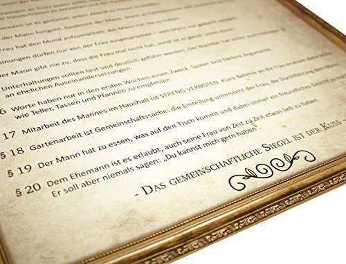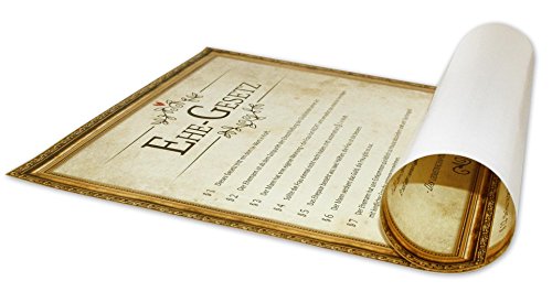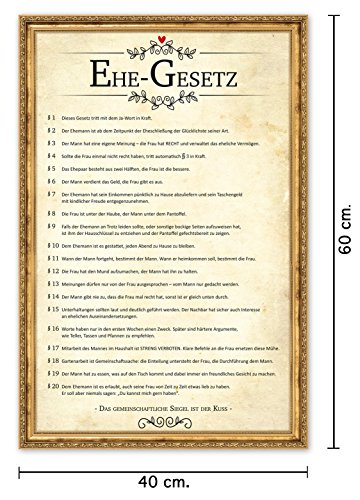 LUSTIG - Das höchst inoffizielle und feierliche Gesetz für eine friedliche und harmonische Ehe. DIE Grundpfeiler für ein reibunsgloses Zusammenleben zwischen Mann und Frau.. PERFEKT ZUM VERSCHENKEN - Das Poster Ehegesetz ist ein optimales Geschenk für frischgebackene Eheleute. Eignet sich perfekt für den Hochtzeitsstreich nach der Trauung und der Hochtzeitsfeier. Der Blickfang an jeder Wand oder Türe.. Das Urkunden-Poster zeigt 20 leicht verständliche Regeln die garantiert jeder versteht. Der Klassiker und unter den Scherzartikeln für die Hochzeit - LACHER garantiert! Die Regeln können auch für die Hochzeitsrede verwendet werden.. TOP QUALITÄT - MADE IN GERMANY - Premium Posterqualität aus deutscher Produktion. Satte Farben, detailierter Druck und tolle Kontraste. Vom Posterprofi Close Up - Über 25 Jahre Erfahrung - TURBO Lieferung mit 100% Zufriedenheitsgarantie. Größe: 40 x 60 cm