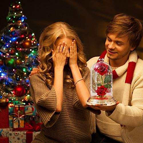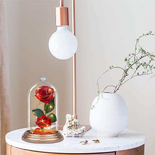 ????Ewige Rose im Glas Geschenk Kit: Rose ist ein Symbol der wahren Liebe, eidenschaftlich und romantisch! Ideales Geschenk Kit. Inklusive roter ewige rose, LED-Streifenlicht, einigen gefallenen Blütenblättern, einer hochwertigen Glaskuppel, einer Vergoldete Basis.. ????Rote Ewige Rose: Die ewige rose ist aus hochwertiger Seidenblumen gefertigt und wirkt realistischer. Rote Rose bedeutet leidenschaftlich und romantisch! Sehr schön und bedeutungsvoll.. ????Romantisch Stimmungslichter im Glas: Die Schöne und das Biest Rose LED-Licht Ird mit 3 AAA-Batterien (nicht im Lieferumfang enthalten) betrieben und ist bequem zu verwenden. Die Länge des LED-Lichts beträgt 2M. Sie können die gewünschte Form kreieren und Schaffen Sie eine romantische Atmosphäre.. ????Transparente Glasabdeckung: Hochwertiges Borosilikatglas, keine Verunreinigungen, klar und haltbar, um die Rosenblume besser zu schützen. Zeigt die natürliche Schönheit des Rosenbouquets.. ????Ideales Geschenk: Diese Kuppel der Rosen kann geöffnet werden, was bedeutet, dass Sie Ringe, Notizen oder andere kleine bedeutungsvolle Gegenstände hineinlegen können, absolut eine perfekte Idee zur Überraschung oder zum Ausdruck Ihrer Liebe. Beste Wahl für Valentinstag geschenke, Muttertagsgeschenke, Hochzeitsgeschenke, Jubiläumsgeschenke, Engagement, Geburtstagsgeschenke usw.