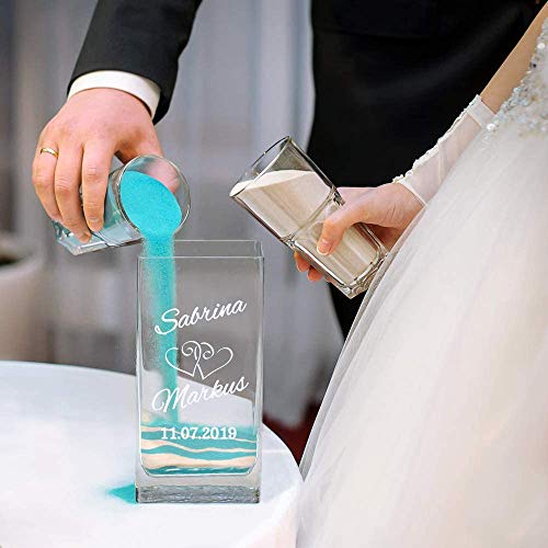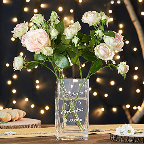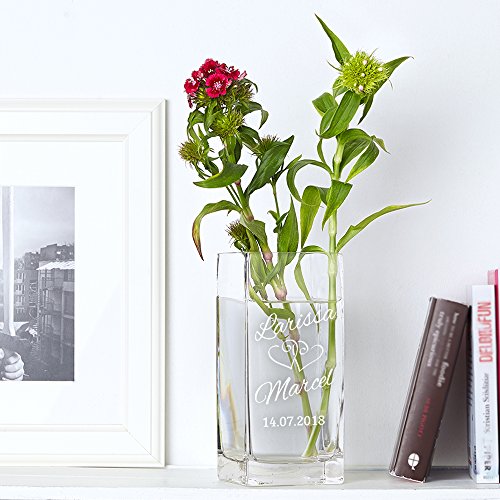 Casa Vivente Blumenvase aus Glas mit Gravur, Motiv Herzen, Personalisiert mit Namen und Datum, Dekoration, Hochzeitsgeschenk für Brautpaar