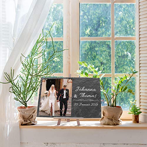 SCHIEFERTAFEL HOCHZEIT: Natur-Schiefertafel für Brautpaare. Individualisierbar per hochwertigem Digitaldruck. Sofortige Onlineanpassung für einen schnellen Bestellvorgang und eine schnelle Lieferung.. NAMEN, FOTO UND/ODER DATUM PERSONALISIERBAR: Die Schieferplatte wird hochwertig im Digitaldruck bedruckt, den Namen,das Bild und/oder Datum passen Sie selbst individuell an für Ihre Schieferplatte.. HOCHWERTIGES NATURPRODUKT: Die Tafel besteht aus echtem Schiefer mit einzigartiger Oberflächenstruktur sowie Maserung, damit ist jede Schieferplatte ein echtes Unikat. Staffelei aus Echtholz.. MAßE & DATEN: Größe der Schieferplatte: 30 x 20cm, Höhe der Staffelei: 25cm, Qualitätsprodukt Made in Germany mit Liebe in Meißen produziert. Naturschiefer mit einzigartiger Bruchkante!. GESCHENK & DEKO: Geschenkidee für Hochzeitspaare, individuelle Hochzeits-Deko, ausgefallenes Hochzeitsgeschenk, Erinnerung, Begrüßungsschild Hochzeitsfeier, Geschenk zum Hochzeitstag.