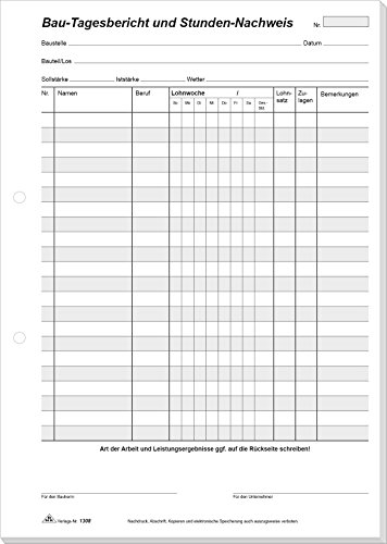 RNK 1308 - Bau-Tagesbericht und Stundennachweis - Block, 3 x 50 Blatt, DIN A4, mit Durchschreibepapier, 1 Stück