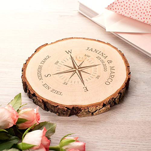 Casa Vivente Baumscheibe aus echtem Holz mit Rinde und Gravur für Paare, Motiv Kompass, Personalisiert mit Namen und Datum, Durchmesser ca. 16 cm