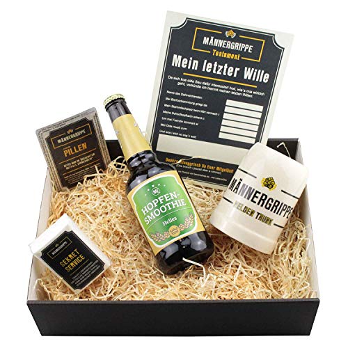Die Männergrippe ist kein Mythos und eine ernst zunehmende Sache. Mit unserem Notfallset sagst Du den Viren den Kampf an.. Das Set von Bavariashop enthält alles, damit Mann wieder gesund wird: 1 Hopfensmoothie, Bierkrug, 1 Päckchen Taschentücher, 1 Dose Pillen (Pullmoll Bonbons).. Der hochwertige Bierkrug mit der Aufschrift "Heldentrunk" rundet das Genesungspaket für richtige Männer ab. Ein Testament für den Härtefall ist vorhanden.. Lache der Krankheit frech ins Gesicht: Unser Set enthält alle Vitamine und Produkte, um schnell wieder fit zu werden.. Das Produkt enthält Alkohol und darf aus diesem Grund nicht an Personen unter dem gesetzlichen Mindestalter abgegeben werden.