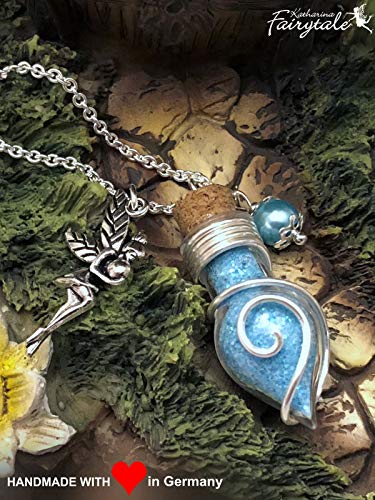 Glücksbringer Halskette mit nachtleuchtenden hellblauem Glitzerstaub in Glasfläschchen. Nachtleuchtfarbe Grünton. Edelstahl Kette: ca. 60 cm, Anhänger ca. 3,5 cm. Mit Bedeutungskärtchen im Visitenkartenformat in deutsch und englisch. Glückskette wird hübsch verpackt geliefert und ist perfekt als Geschenk für die Liebsten geeignet. Liebevolle Handarbeit aus Deutschland. Bestens geeignet zum Verschenken. Farbe der Kette, Verzierung und Elfe Fee: silber. Schönes Schmuck Geschenk für die beste Freundin, Schwester, Tochter, Ehefrau, Mutter, Verlobte, oder auch als Geschenkidee zu Weihnachten, Nikolaus, zum Geburtstag, Hochzeitstag, Valentinstag, Muttertag, Schuleinführung, Jugendweihe, Konfirmation, Ostern oder als kleines Dankeschön für einen lieben Menschen. Ideal als einzigartiges Geburtstagsgeschenk, Muttertagsgeschenk, Ostergeschenk oder Valentinstagsgeschenk. Kette und Kettenanhänger inkl. Geschenkverpackung (Organzabeutel). Um den nachtleuchtenden Effekt des Anhängers zu erzeugen bei Tageslicht oder unter einer künstlichen Lichtquelle "aufladen"