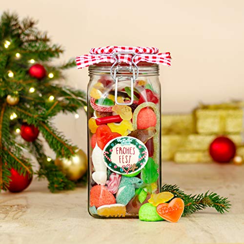 Eine bunte Mischung bester Süßigkeiten, mit weihnachtlichen Motiven und leckerem Fruchtgummi, die Dich an Deine Kindheit erinnern. Leckere Süßigkeiten-Mischung bestehend aus Cola-Kirsch, Hitschler, sauren Bändern, weißer Mäusespeck, Liebesherzen - alles was das Naschherz begehrt. Tolle Geschenkidee für die Adventszeit, ganz besonders freuen sich Oma und Opa darüber, aber auch die Enkelkinder machen große Augen, wenn sie dieses tolle Einmachglas voller Süßigkeiten sehen. Ein hochwertiges Bügelglas in großer Größe, mit karierten Vichy-Tuch. Dieses Glas kannst Du auch super weiterverwenden und weiterschenken, wenn Du magst. Frisch verpackter Süßigkeiten-Spaß, 830 Gramm Naschfreude in süßem original Bügelglas mit Spannverschluss