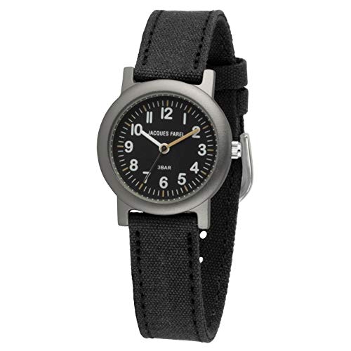 STOFFBAND aus BIO-BAUMWOLLE; allergikerfreundliches Gehäuse aus Reinaluminium mit veredelter Oberfläche, Ökoband und Gehäuse in der harmonischen Kombination von Schwarz und Grau. DEUTLICHES ZIFFERBLATT mit großen Zahlen auf schwarzem Hintergrund; auch als Lernuhr geeignet, Gehäuseboden und Krone aus Edelstahl. BAND aus ÖKO-BAUMWOLLE, selbst die Garne sind ökologisch zertifiziert; Bandlänge für einen Armumfang von 13,5 bis 17,5 cm, Bandbreite 1,4 cm; Schließe aus Edelstahl. ORIGINAL JAPANISCHES QUARZWERK mit analoger Anzeige und Mineralglas, geschützt durch eine Wasserdichtigkeit von 3 bar; Durchmesser 27 mm, Gehäusehöhe 8 mm. QUALITÄTSUHR DER MARKE JACQUES FAREL mit gutem Service in Deutschland; ein nachhaltiges und schönes Accessoire für Kinder, ideal als Geschenk zur Einschulung oder zum Geburtstag