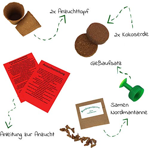 Pflanze deinen eigenen Christbaum. Unser Tannenbaum Anzuchtset enthällt alles was du benötigst um deinen eigenen Weihnachtsbaum zu züchten.. Inhalt: 5 Samen der Nordmanntanne, 2 Anzuchttöpfe, 2 Kokos Quelltabletten, 1 Gießaufsatz zur schonenden Bewässerung, Anzuchtanleitung und Ursprung und Herkunft des Weihnachtsbaumes.. Besondere Geschenkidee: Unser Tannenbaum Anzuchtset ist eine witzige und persönliche Geschenkidee zu den verschiedensten Anlässen. Ob als Wichtelgeschenk, kleines Weihnachtsgeschenk oder Nikolausgeschenk.. Unser Anzuchtset wird in liebevoller Handarbeit in Deutschland zusammengestellt. Wir wünschen dir viel Freude mit unseren Pflanzset!