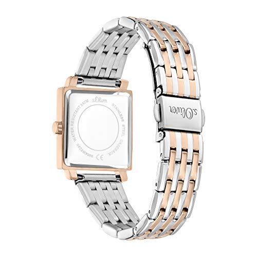 Hochwertige s.Oliver Armbanduhr aus Metall Mit mehrfarbigem Edelstahlband und japanischem qualitätswerk. Eckiges Metallgehäuse poliert, Größe 26 x 26 mm, kratzunempfindliches Mineralglas, Wasserdichtigkeit geprüft bis 3 ATM. Edelstahlband Bicolor poliert mit Faltschließe, Länge 195 mm, Gehäuseboden, und Krone aus Edelstahl. Gut ablesbares Zifferblatt. Verpackt in Original s.Oliver Geschenkverpackung