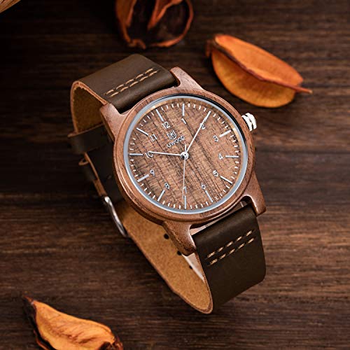 Einzigartige Eleganz:Die Kombination der holz-Uhr mit dem Uhrarmband vereint sich zu einem modernen und zugleich minimalistischen Look und macht diese Holzuhr zu einem unserer beliebtesten Designs in unserer Kollektion.. Ökoprodukt: Aus ereuerbarem Naturholz gemachte Holz armbanduhr wiegt sich sehr leicht und hat einen guten Tragekomfort nach feiner Polierverarbeitung. Der Leder armband wegen der niedirgien Hautempflichkeit ist mehr geeignet für Allergiker. Hochwertige Holzuhr: Japanisches Quarzwerk zur präzise Zeitmessung und bis 2 Jahre lange eingebaute Knopfzelle, kratzfestes Mineralglas, verbraucherfreundliche aus Edelstahl Buckle, Very easy to wear.Es ist sehr leise! Kein lautes Ticken wie andere Uhren.. Ideales Geschenk: Ein optimales Geschenk gesucht? Die Holzuhr mit elegantem Aussehen passt allem Anlass und gilt als ein tolles Geschenk wie beim Geburtstag, Gedenktag, Fest oder für Ihren besonderen Umgang. Zuverlässiger Kundenservice: Auf Kundenfreundlicher Richtlinie genießen Sie bei uns kostenlosen Austausch, unbedingte Retoure und schnelle Antwort. Lieferumfang enthält schöne Holzuhr für herren damen unisex, Handbuch nämlich Garantiekarte, holz Armband
