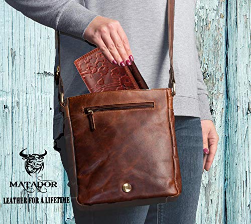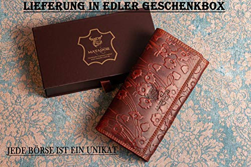 MATADOR Damen Langbörse TÜV Geprüfter RFID & NFC Schutz Leder Geldbörse Blumenmuster Vintage Antik Braun