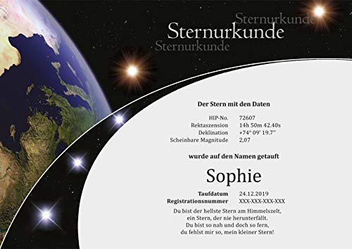 Eine Sterntaufe ist ein Geschenk, das von Herzen kommt. Sie wird den Beschenkten ewig begleiten und immer in Erinnerung bleiben. Schenken Sie dieses einzigartige Geschenk einem ganz besonderem Menschen!. Die Sterntaufe "Starlet" ist unser kleinstes Paket. Wir benennen einen schwach leuchtenden Stern, der außerhalb von Städten aber noch mit bloßem Auge sichtbar ist. Der Stern erhält Ihren Wunschnamen und wird in das Starling Sternregister eingetragen.. Sie erhalten ein Geschenkpaket bestehend aus: Urkunde, Sternkarte, Informationsblätter zu Ihrem Stern und Sternbild und eine Anleitung zum Finden des Sterns. Alle Unterlagen kommen in einer representativen Geschenkmappe.. Die Unterlagen werden auf hochwertigem 250 g/qm Papier auf einer professionellen Druckmaschine gedruckt. Kein dünnes herkömmliches Bürodruckerpapier, sondern ein starker Karton. Sie werden den Unterschied fühlen! Alle Sterntaufen werden in das internationale Starling Sternregister eingetragen.. Bei unserer Sterntaufe "Starlight" wird ein hellerer Stern getauft und Sie können einen persönlichen Widmungstext hinzufügen. Bei der Sterntaufe" Zodiac" können Sie sich zusätzlich das Sternbild aussuchen und wir taufen einen der sehr gut sichtbaren Hauptsterne dieses Sternbildes. Bei der Sterntaufe "Supernova" wird einer der hellsten Sterne des Sternbildes getauft und Sie erhalten noch viele Extras gratis dazu.