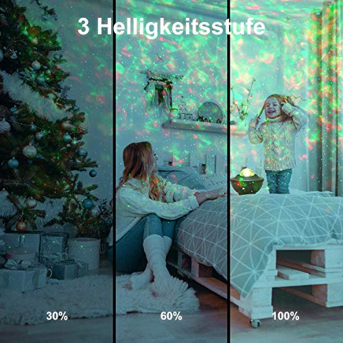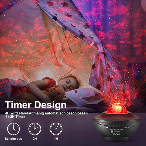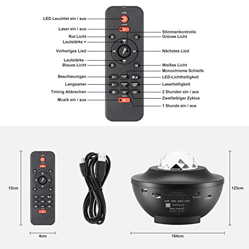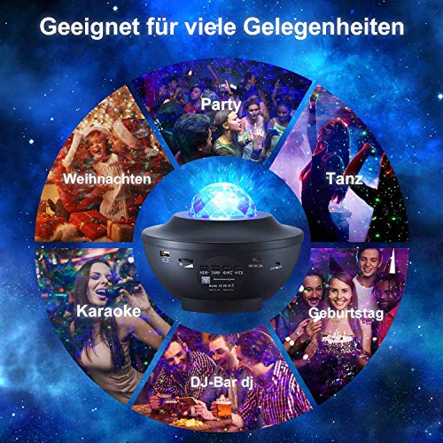 ?Der Sternenhimmel projektor hat eine dynamische 360 ??° -Drehprojektion von 10 Farben. Die funkelnden Sterne und Wolken werden dynamisch auf die Decke oder Wand projiziert und erzeugen einen schönen und farbenfrohen Himmel- und Ozeaneffekt. Die Wellen und Sterne können einzeln oder in Kombination gespielt werden. Es kann als spezielles Nachtlicht verwendet werden, das ein ausgezeichnetes Umgebungslicht darstellt.. ?LED-Sternenhimmel-Projektionslichter können eine Vielzahl von Farben bringen. Der neueste sprachaktivierte Blinkmodus, Meereswellen und Sterne ändern sich schnell mit den Änderungen der Musik und schaffen eine entspannte, romantische, farbenfrohe Raumprojektionsatmosphäre, die Ihnen einen wunderschönen Sternenhimmel zeigt.Wenn sich der Projektor dreht, bewegt sich der interne Motor, was ein bestimmtes Geräusch verursacht, Dies ist normal!. ?Das Nachtlicht hat eine Timer-Funktion, 1H, 2H. Nach einer voreingestellten Zeit erlischt das Nachtlicht automatisch. Standardmäßig wird es innerhalb von 4 Stunden automatisch heruntergefahren. Mit der Fernbedienung können Sie alle Funktionen einschließlich Lichtmodus, Musik, Lautstärke und Helligkeit umschalten und Timer einstellen.. ?Starry sky projector kann als Musikplayer verwendet werden. Das USB-Flash-Laufwerk lädt Musik im Voraus herunter und schaltet dann das Sternlicht ein, um die Musik automatisch auf dem USB-Flash-Laufwerk abzuspielen. Wenn Sie gleichzeitig ein USB-Flash-Laufwerk und Bluetooth verbinden, hat das USB-Flash-Laufwerk Vorrang.. ?Der USB-Sternprojektor eignet sich sehr gut für Geburtstage, Partys, Hochzeiten, Raumdekoration, Kindertag, Weihnachten, Jubiläumsgeschenke usw. Es ist für Kinder geeignet, eine bequeme und entspannende Schlafenszeit zu schaffen, um Kinder beim Einschlafen zu beruhigen und zu trösten. Es ist ein tolles Geschenk für Kinder und Freunde.