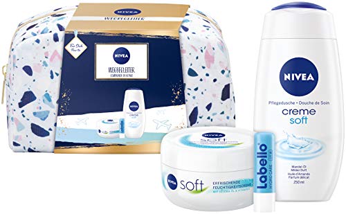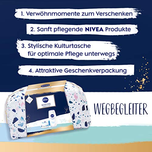 Praktisches Pflegeset – Das Geschenkset bietet mit stylischer Kulturtasche, Pflegedusche, Feuchtigkeitscreme und Lippenpflege einzigartige Wohlfühlmomente. Zarte Verwöhnmomente – Mit wertvollem Mandel-Öl reinigt die NIVEA Pflegedusche Creme Soft die Haut sanft und verwöhnt mit samtweichem Schaum sowie mildem Duft. Erfrischende Creme – Die im Pflegeset enthaltene NIVEA Soft Creme versorgt die Haut mit Feuchtigkeit und verleiht ihr einen belebenden Frische-Kick. Zarte Lippen – Mit Sheabutter und natürlichen Ölen pflegt der Labello Hydro Care die Lippen und spendet langanhaltende Feuchtigkeit für spürbar zarte Lippen. Lieferumfang & Details – NIVEA Wegbegleiter Set mit Kulturtasche, NIVEA Pflegedusche Creme Soft (250 ml), NIVEA Soft Feuchtigkeitscreme (200 ml) und Labello Hydro Care (4,8 g), Artikelnr. 95211