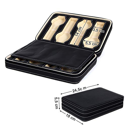 Hochwertige Verarbeitung - Aus mitteldichter Holzfaserplatte (MDF) angefertigt und mit hochwertigem Kunstleder überzogen ist der Uhrenkasten leicht und dennoch stabil. Innen mit hochwertigem Samt ausgekleidet, fühlt sich weich an. Produktmaße: 24,5 x 18 x 5,5 cm (B x H x T ), jede Zelle: 14 x 3,5 cm. Klassisches Design - Mit den zusätzlichen weißen Nähten auf diesem Etui ist es auffällig. Zwischen dem Ober- und Unterteil befindet sich eine PU-Abdeckung, die Ihre Uhren vor Zusammendrücken und Kratzern schützen kann – sehr praktisch. Hohe Funktionalität - Perfekt für den persönlichen Gebrauch und geschäftliche Nutzung. Ausreichend Platz für 8 Armbanduhren. Geeignet für die Uhr, deren Durchmesser bis 55 mm, und Dicke bis 15 mm ist. Die Uhren in den Fächern werden auch über ein Gummiband sicher gehalten. Prakticher Reisebegleiter - Diese schicke Uhrenschatulle mit Reißverschluss in stilvollem Design schützt Ihre Uhrensammlung vor Staub und Kratzern. Mit dieser Uhrenbox kann man bequem die Uhrensammlung auf Reisen mitnehmen. Hohes handwerkliches Können - In behutsamer Handarbeit gefertigt, alle Einzelheiten sind detailliert ausgearbeitet. Die schöne Kunstleder-Optik verleiht dem Schmuckkoffer ein schlichtes, und elegantes Aussehen