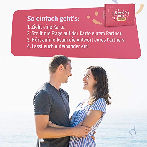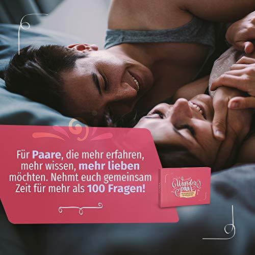 WAS DU BRAUCHST: Auf der Suche nach einer lustigen und originellen Möglichkeit deinem Partner näher zu kommen und noch mehr über Sie/Ihn zu erfahren? Möchtest du ein tolles Weihnachtsgeschenk für diesen einen besonderen Menschen? "Wunderpaar" ist die perfekte Lösung!. PERFEKT FÜR ALLE ANLÄSSE: Ob es sich um einen Geburtstag, den Valentinstag oder um Weihnachten handelt, "Wunderpaar für Verheiratete" ist die richtige Wahl als Geschenkidee!. FRAGEKARTENSPIEL: Genießt die Zweisamkeit mit diesem aufschlußreichen und interessanten Kartenspiel für Erwachsene, mit dem ihr euch gegenseitig besser kennen lernen könnt! Die mehr als 100 Fragen werden tiefgründige und manchmal auch witzige Gespräche anregen und eure Partnerschaft stärken (und zwar besser als es jeder Beziehungsratgeber je könnte)!. FÜR DEN LIEBLINGSMENSCH: Bestelle dieses erstaunliche Spiel für deinen Partner. Egal ob als Geschenk für Männer oder Frauen, du kannst sicher sein, dass dieser Liebesbeweis super ankommt! Das Spiel ist extrem vielseitig und kann euch dabei helfen, euer ganz besonderes Ritual zu etablieren, bei dem ihr euch z. B. jeden Abend vor dem Schlafengehen 2 bis 3 Fragen stellt!. DAS IDEALE GESCHENK: Ihr sucht romantische Weihnachtsgeschenke oder Geschenke für Männer zu Nikolaus, Geschenkideen für Männer oder einen Freund, dass ihm zeigt: "Ich liebe dich", aber weißt nicht was du ihm schenken sollst? Mach ihm eine Freude - Schenke "Wunderpaar für Verheiratete"! Für alle, die langweilige Weihnachtsgeschenke für Männer satt haben und lieber ausgefallene Geschenke bevorzugen.