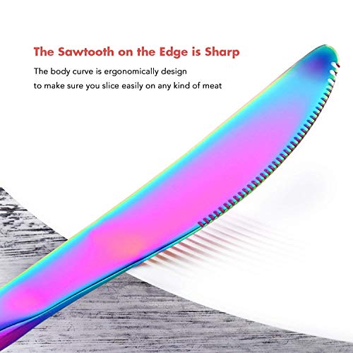 Hergestellt aus lebensmittelechtem hochwertigem Edelstahl, langlebig und langlebig, gesund und umweltfreundlich, ein großartiges Herstellungsverfahren bringt Ihnen die großartige Benutzererfahrung, bleibt für eine lange Zeit leicht neu. Der Sägezahn am Rand ist scharf, die Körperkurve ist ergonomisch gestaltet, um sicher zu stellen, dass Sie leicht auf jede Art von Fleisch schneiden können. Der Löffel hat eine fein polierte Kante, damit er sich im Mund nicht scharf und rau anfühlt. Gabel ist auch sorgfältig an allen Kanten poliert, Design, um Lebensmittel leicht und mühelos zu durchdringen. Jedes einzelne Besteck wird für mehrere Male fein poliert, um schließlich das perfekte Spiegelglanz-Ergebnis zu erreichen, das mit der auffälligen regenbogenartigen Kombination aus Gold, Gelb, Rosa, Blau und Lila überzogen ist und dieses tolle Aussehen hervorhebt. Das HOBO 24-teilige Besteckset ist mit einer schönen schwarzen Box verpackt, es verleiht Ihm ein luxuriöses Gefühl und gewährt die beste Zufriedenheit bei der Selbstnutzung und ist auch eine perfekte Geschenkwahl für Freunde und Familie, es eignet sich auch für den Einsatz im Restaurant , Hotel, Alltagshaushalt oder jede andere Gelegenheit. Das HOBO 24-teilige Besteck-Set beinhaltet 6 Steakmesser, 6 Gabeln, 6 Esslöffel und 6 Teelöffel. Um das Aussehen neu und glänzend zu erhalten, sollen Sie das Set weder in der Spülmaschine reintun, noch waschen Sie es einem Schleifpinsel. Sie sollen es mit der Hand waschen und es mit einem Handtuch abtrocknen