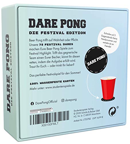 ???? DAS ORIGINAL: Dare Pong ist das deutsche Original. Von anderen kopiert, aber stets unerreicht! Der innovative Spiel-Zusatz für Euer Beer Pong Vergnügen. Ideal auf Festivals, Zeltplätzen, Campingtrips, Gartenpartys oder beim Outdoor-Vortrinken.. ???? 75 VERRÜCKTE DARES, die Eure Festivalerfahrung auf ein neues Level heben! Legt unter jeden Beer Pong Becher eine unserer Festival-Dares (Aufgaben)! Trifft das gegnerische Team einen Becher, kann dieser gerettet werden, indem Ihr die Aufgabe erfüllt. Traut Ihr Euch - oder trinkt Ihr lieber?. ???? DAS GADGET für Festival-Liebhaber und Camping-Begeisterte, die ihre Komfortzone verlassen möchten: Flirtet mit Fremden, beweist Eure Kreativität oder erhöht einfach Euern Pegel mit der Dare Pong Festival Edition!. ???? DARE PONG ERWEITERUNG: Die Festival Edition ist individuell oder in Kombination mit dem originalen Dare Pong spielbar.. ???? Wasserfeste und reißfeste Karten | Altersempfehlung: 18+ | Ideale Spieleranzahl: 2-8 | Auch für Paare geeignet | Spaß für Männer und Frauen | Vorsicht: Nicht mit Festivalmuffeln in Berührung bringen ????
