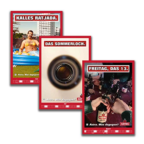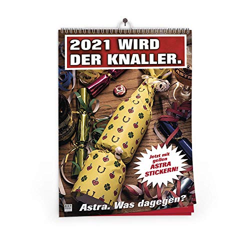 Sag Jahr zu Astra: Es kann kein Zufall sein, dass jedes Jahr mit einem Feiertag beginnt, seitdem es die Astra-Kalender gibt – ob dieses Phänomen in 2021 wieder eintritt?. Was dagegen?: Der Jahreskalender sorgt mit 12 verschiedenen Monatsblättern, frechen Sprüchen und Motiven jeden Tag für gute Laune – besser als jedes Ölgemälde.. Wohlgeformte Rundungen statt klappriger Engel: Astra fängt alle ab, die mit dem Kopf durch die Wand wollen und schmückt mit diesem Motivkalender jede Wand.. Gutes bleibt hängen: Weil dieses Prachtexemplar in keinem Haushalt fehlen darf, eignet sich der Kalender mit Spiralbindung als perfektes Geschenk zu Weihnachten oder für's neue Jahr.. Lieferumfang: 1 x A3 Wandkalender 2021 mit Stickerbogen von ASTRA
