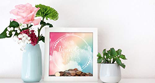 Wunderschön gestaltete Spardose mit dem Aufdruck „Wunderbares“ – für Scheine, Geldstücke und kleine Dekoobjekte. Der Rahmen eignet sich mit der Sparschwein-Funktion für Gutscheine oder Geldgeschenke – ideal um Geld kreativ zu verschenken zur Geburt, zur Hochzeit, zum Geburtstag oder zum Einzug. Das farbige Motiv im Hintergrund ist auswechselbar und kann durch eigene Motive oder Fotos ausgetauscht werden – für ein individuelles Geschenk für die Freundin, den Freund oder das Hochzeitspaar. Die stabile Rückwand des Bilderrahmens sorgt für ein sicheres Entnehmen des Geldes und die Glasscheibe gibt dem Dekobjekt ein hochwertiges Aussehen – Maße 20,5 cm x 20,5 cm x 5 cm. Auf der Rückseite befindet sich ein Haken, so eignet sich der Wechselbilderrahmen zum Hinstellen und zum Aufhängen – eine wunderschöne Deko für das Wohnzimmer oder Schlafzimmer